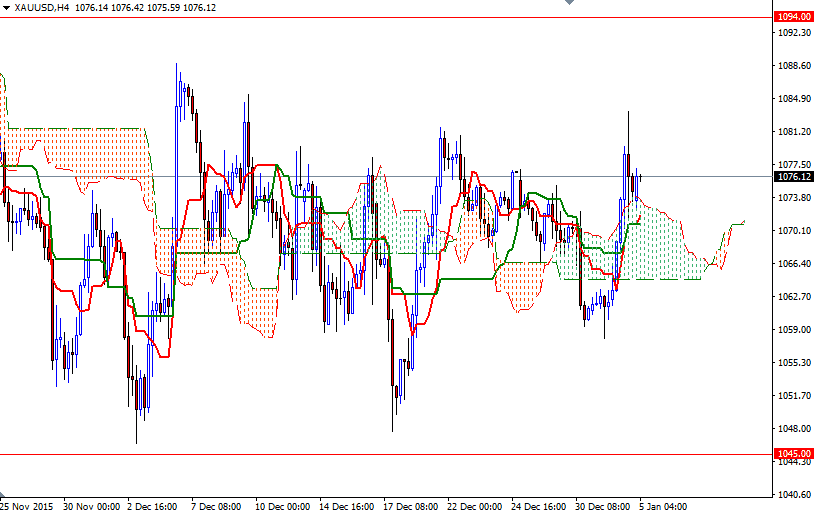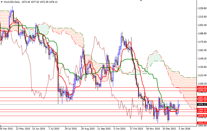 This week sees a deluge of economic reports, including the monthly non-farm payrolls report and minutes from the Federal Open Market Committee’s December 15-16 gathering. From a technical point of view, the short-term outlook appears to be slightly positive. We have positively aligned Tenkan-Sen (nine-period moving average, red line) and Kijun-Sen (twenty six-day moving average, green line) lines on both the daily and 4-hourly charts, along with Chikou Span/Price crosses in the same direction. If the 1070/68 support remains intact, we could see a renewed push up to the 1081.55 level. The area between the 1087 and 1089 levels has been resistive in the past so clearing that resistance is essential for a bullish continuation towards 1094. However, if the market dives below the 1070/68 area, then the XAU/USD pair will probably fall to the 1064.50 level before finding some support. Closing back below 1064.50 would indicate that the market is getting ready to revisit the support at 1058.