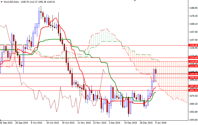 Gold retreated on Friday as investors took profits from a recent rally to a nine-week high. Despite Friday’s decline, the XAU/USD pair ended the week up nearly 4% to settle at $1104 an ounce, bolstered by safe-haven demand as falling oil prices, geopolitical risks and China fueled fears hit equities. Major stock indexes posted heavy weekly losses, oil prices retreated to another 12-year low and a nuclear test by North Korea added to worries. In the latest economic data, December payrolls growth came in above expectations. The Labor Department reported that the economy added 292000 jobs in December, surpassing consensus estimates of 203000. Data also showed that gains for the prior month were revised up but average hourly wages stagnated.