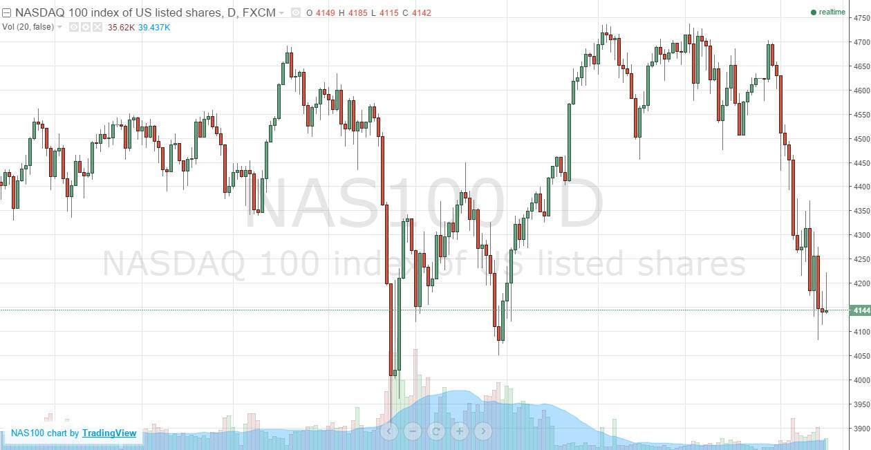 The NASDAQ 100 tried to rally during the course of the day on Tuesday, but found more than enough resistance just above the 4200 level to turn things around and form a shooting star. The shooting star of course is a very negative sign, and it now looks as if we are going to try to break down below the 4100 level. If we can do so, the market could very well find itself testing the 4000 level below.