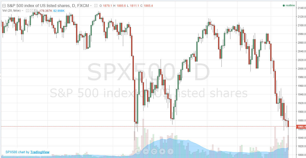 The S&P 500 fell rather significantly during the day on Wednesday, but bounced enough off of the 1810 level to form a massive hammer. Because of this, we have to wonder whether or not we are going to see some type of attempt to turn the market back around. I won’t be buying it though, because it is far too bearish at this point in time in there is far too much in the way of resistance above for me to feel comfortable going long. In fact, I would have to see this market get above the 1950 level in order to feel comfortable at this point.