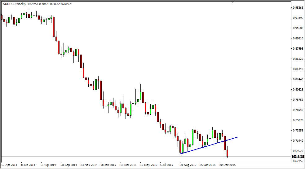 The AUD/USD pair fell during the course of the week, and it now appears that the market is going to continue to go much lower. I believe at this point in time the next target is the 0.65 handle, and it is only a matter of time before we reach that level. However, we could get a few short-term rallies, but I look at those as nice selling opportunities.