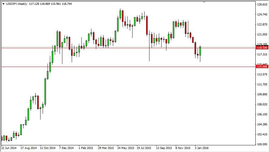 The USD/JPY pair formed a bullish candle during the course of the week, but most importantly broke the top of a shooting star from the previous week. Now that we are above the 118.50 level again, I believe that this market will continue to go higher. With this, I believe that short-term pullbacks are buying opportunities, and of course a break above the top of the range for the week also offers buying opportunities.
