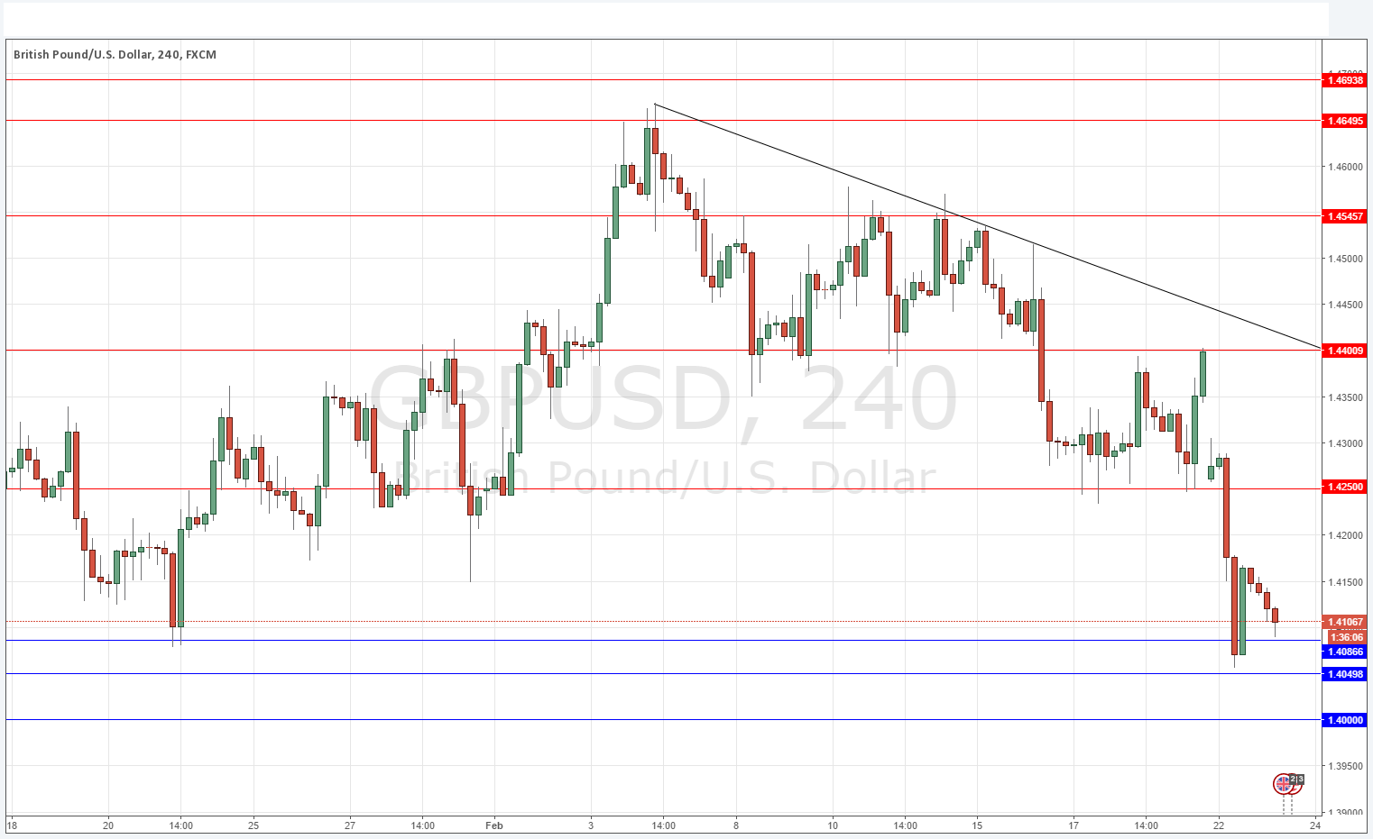 We got a bounce from a level that was very close to key support I had identified at 1.4050. I now see the area between 1.4087 and 1.4050 as a wide zone of support, and there should also be additional support below that at the key round number of 1.4000.