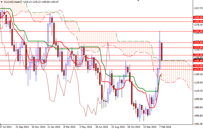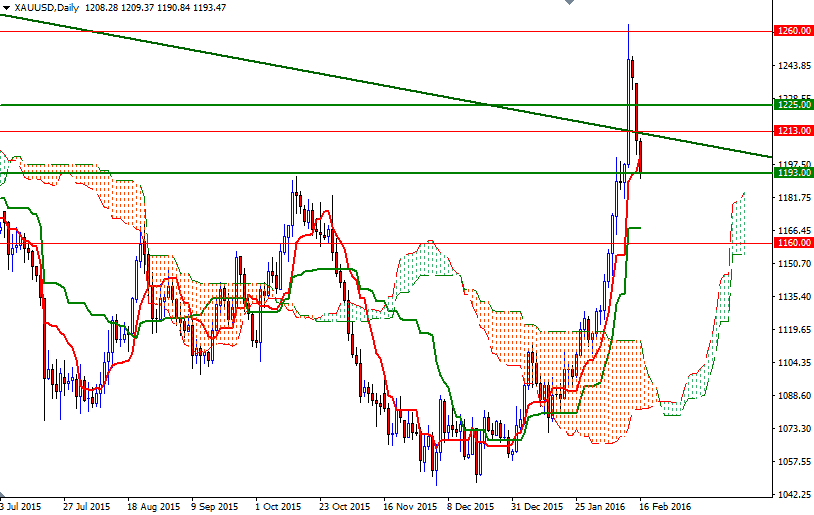 Prices dropped further during today's Asian session on technical selling as closing below the 1213 level put extra pressure on the market. As a result, the XAU/USD pair reached the 1193/1 area where the top of the weekly Ichimoku cloud sits. These clouds not only identify the trend but also define support and resistance zones.