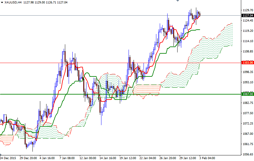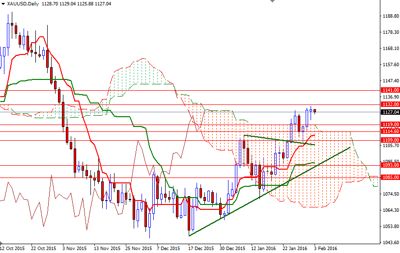 Gold prices rose slightly on Tuesday closed the day at $1128.78 an ounce. Although the precious metal's safe-haven appeal intact as equities and oil prices continued their slide, the market remained in a relatively tight range. The pattern on the daily chart suggests that gold prices will tend toward consolidation as markets await key U.S. data. Today sees the release of ADP employment report and ISM non-manufacturing PMI data but of course the highlight of the week will come on Friday when the Labor Department releases its employment report for January.