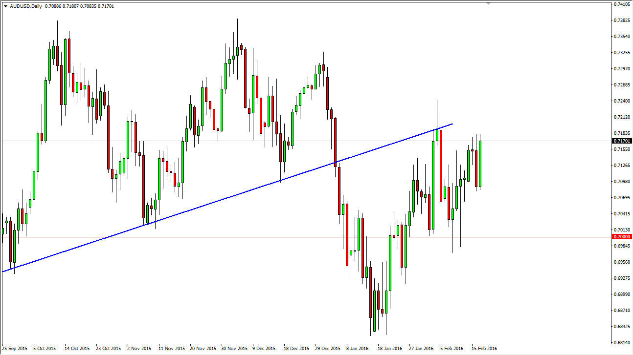 If we did break above the 0.7250 level, at that point in time, I feel that the Australian dollar could really start to rally at that point. But I also understand that there are a lot of concerns in Asia, and that always weighs upon the Australian dollar as it is considered a proxy for Asian growth. On top of that, we also have gold markets which look rather healthy but don’t seem to be helping the Aussie, which is a bit of an anomaly in and of itself. Given enough time, I think we continue to consolidate between the 0.70 level on the bottom, and the 0.72 level on the top.