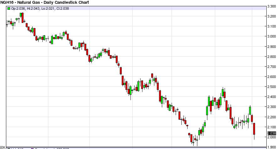 The natural gas markets fell drastically as well, slicing through the $2 level. By doing so, it looks as if we are going to test the lows again, and it is probably only going to be a matter time before we break down below the $1.90 handle. If we do that, I would suspect that the market could go as low as $1.75 in the short-term, but God Himself only knows where the bottom is at this point.