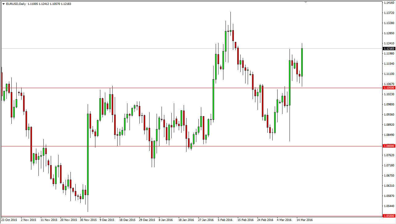 During the session on Wednesday, the EUR/USD pair initially fell to try to find support at the 1.1050 level, found it, and then turn right back around to break out to the upside. This was helped by the fact that the Federal Reserve has finally cut down forecast for interest-rate hikes going forward. While at one point there was a suggestion that we would have four interest-rate hikes by the end of year, the Federal Reserve now looks at two as being the likely number. This is much softer than originally anticipated, so it makes sense that the US dollar would lose quite a bit of strength against the Euro. With this, I believe that this pair continues to go higher and that we are going to reach towards the 1.13 level, and then eventually the 1.15 level after that.