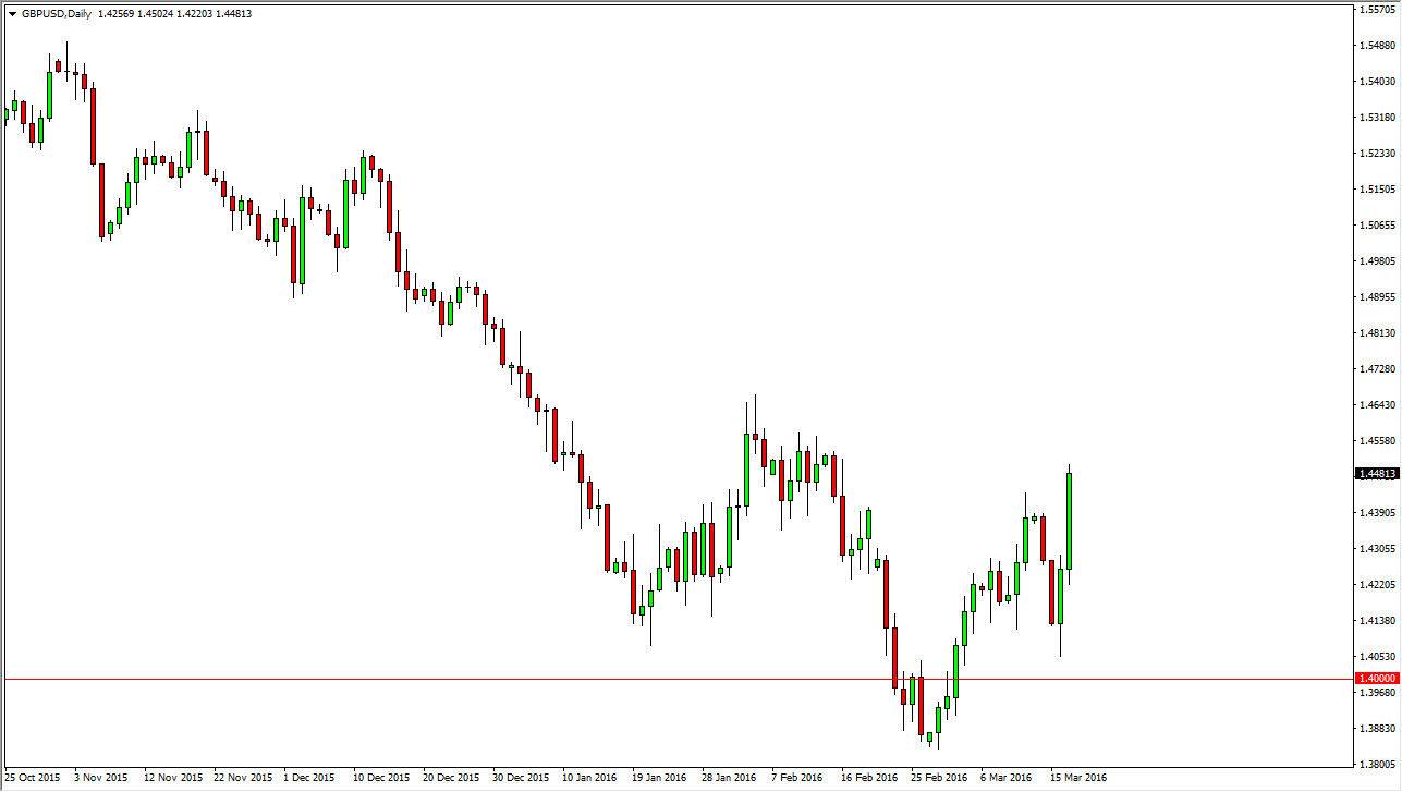 The GBP/USD pair broke higher during the course of the session on Thursday, testing the 1.45 level. That being the case, the market looks as if it is ready to continue going higher but it’s very likely that we have to pullback to find enough momentum to shoot this market to the upside. Keep in mind though that the United Kingdom may possibly exit the European Union, so there is a little bit of hesitation when it comes to this particular pair. Even though this market should continue to go higher, the reality is that it will probably underperform the EUR/USD pair as an example.