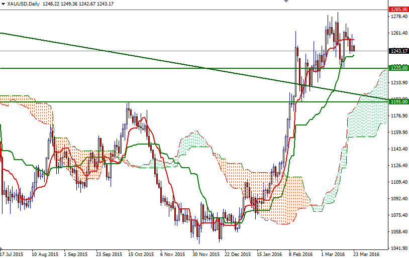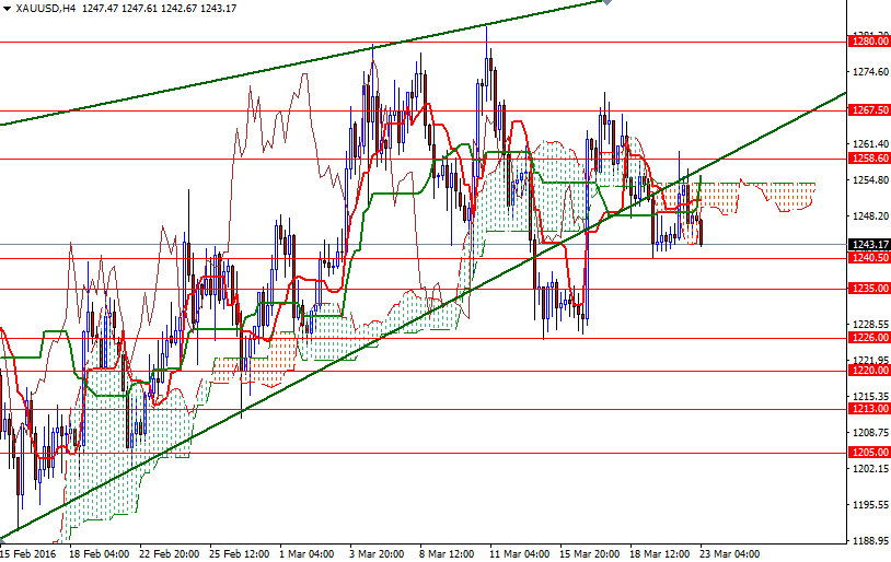 If the 1240.50 level is broken, then the market will probably continue to retreat and test the support in the 1235/3 region. The bears will have to capture this area so that they can make an assault on the bulls' camp at 1226(5). Breaching the 1226/5 support is essential for a bearish continuation targeting the 1220 and 1213 levels. To the upside, expect to see resistance in the 1254.30-1258.60 zone where the top of the 4-hourly cloud, broken trend line of a rising wedge and a horizontal resistance cluster. If XAU/USD penetrates this tough barrier, I think the 1267.50 level will be the next stop. Once beyond that, the market will be aiming for 1275 and 1280.