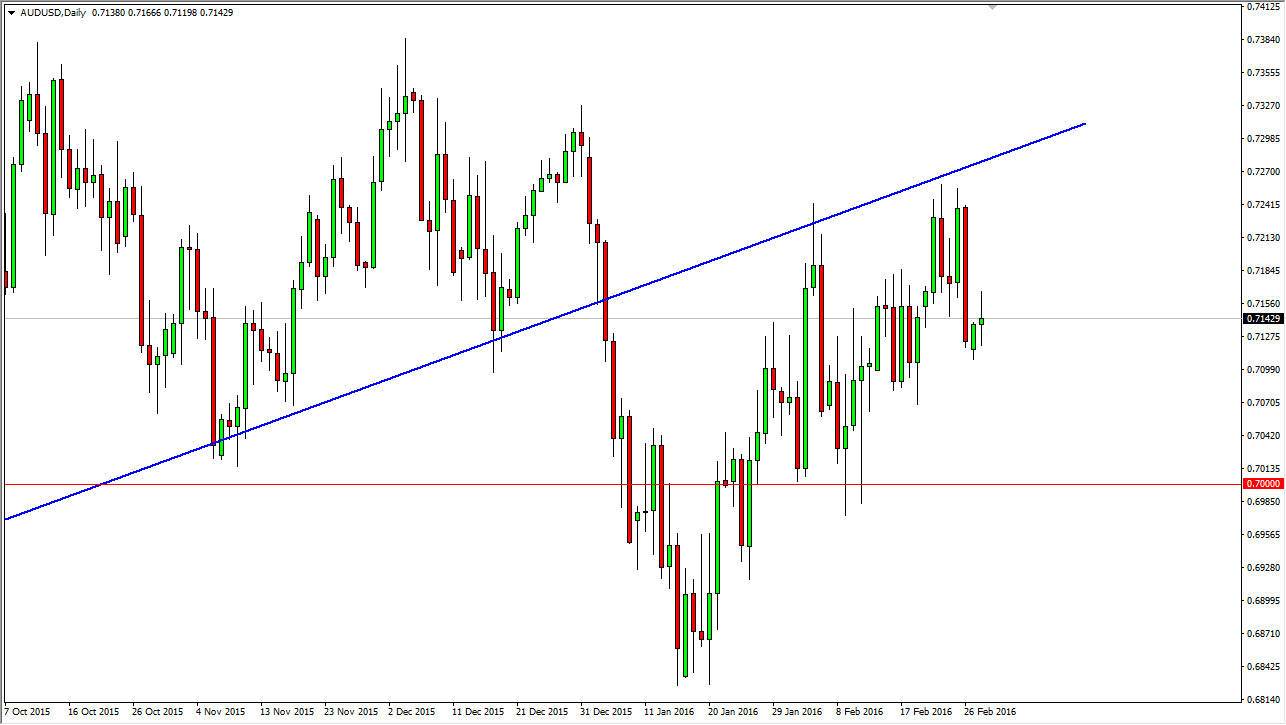 The USD/JPY pair fell initially during the day on Monday, but found enough support below to turn things around and form a bit of a hammer. This hammer of course is a bullish candle but quite frankly I feel that we are in the middle of the larger consolidation area so I'm not exactly excited about trading at this point. I suppose if I had to put money in this market, I would anticipate that the US dollar will continue to rise against the Japanese yen, but only for a while as the 115 level above should be massively resistive. We believe that at this point in time we may have found ourselves a new consolidation area between 110 on the bottom, and 115 on the top. With that being the case, we have to wait until we get to one of the extreme levels to start placing money into this market.
