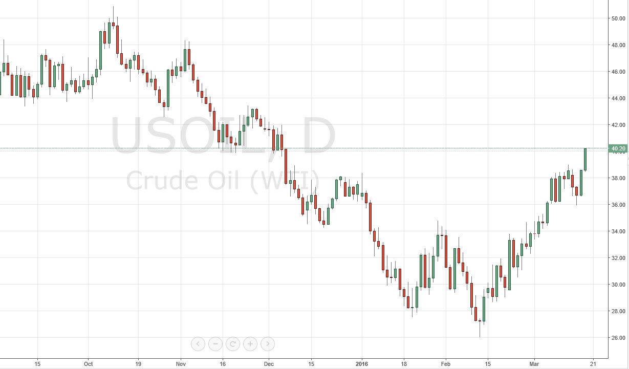 The WTI Crude Oil market rose during the course of the session on Thursday, breaking above the $40 level. This is a very interesting move, because we know that shale oil producers are looking to enter the market somewhere around the $40 level. Because of this, it’s hard to imagine this market going higher without too much trouble, but at this point traders are looking optimistic as the production freezes seem to scare people that supply could be an issue. With this being the case, the market will more than likely find resistance above, but right now there are no signs of it. An exhaustive candle would be reason enough to start selling and with that I’m simply waiting. I have no interest in buying this market, because it's only a matter time before supply overwhelms demand.
