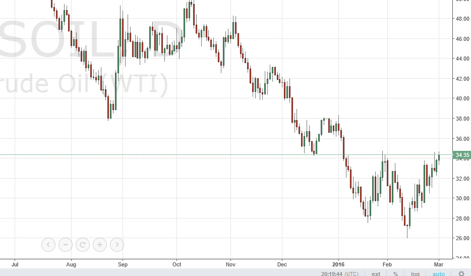 The WTI Crude Oil market rose again during the course of the day on Tuesday, but remains below the $35 level. I recognize that we are starting to see a real fight coming out of this market, but at the end of the day I do not see how we rally for much farther going forward. After all, the most important thing to keep in mind is that US shale producers will not hesitate to flood the market at $40 a barrel. This has been said recently, and that of course will keep quite a bit of a lid on this market.