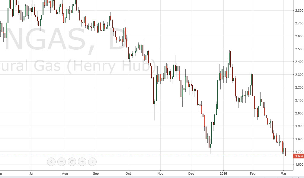 Natural gas markets continue to get beat up as they fell significantly during the course of the day on Wednesday to make a fresh, new low. With this, it’s more than likely going to be a market that you can sell every time we rally, and show the very first signs of resistance. The market will more than likely try to reach down to the $1.50 level next, and it will take quite a bit to change the trend at this point in time. Quite frankly, this reminds me a lot of the gold markets in the 80s, when there was a time of money to be made selling the market every time it rallies.