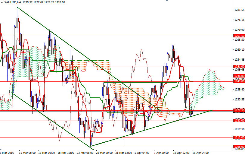 Gold prices continued to fall yesterday, extending losses to third straight session, as a stronger dollar reduced the appeal of the precious metal as an alternative investment. Although the XAU/USD pair bounced up quite nicely from the top of the Ichimoku cloud on the 4-hour time frame, the bulls failed the overcome the resistance in the 1246/3 region. As a result, prices dropped with momentum all the way back to the 1223.80 level where the top of the daily cloud and short-term bullish trend line intersect.