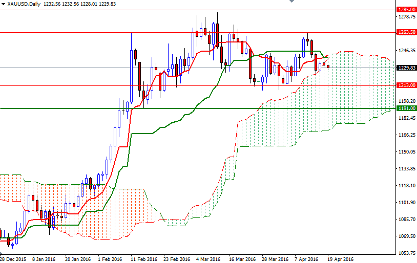 However, if prices break down below the 1227.50 level, then it is likely that the market will visit the 1222 level afterwards. A break below 1222 -a move that would cause the Chikou-span (closing price plotted 26 periods behind, brown line) to fall through the 4-hourly cloud- could trigger a drop towards 1215/3. Once below 1213, the market will be aiming for the 1208/5 area.