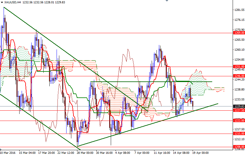 Gold prices ended Monday's session down $2.15 as safe-haven buying subsided after crude oil prices recovered from earlier losses and equities edged higher. The XAU/USD pair traded as high as $1241.59 an ounce but buying dried up and selling pressure increased below the 1243 resistance. As a result, the market reversed and headed back to the short-term bullish trend line which became confluent with the horizontal support at 1227.50.