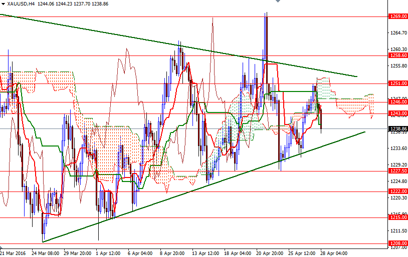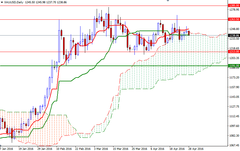 The daily Ichimoku cloud continues to act as a support but prices are still below the cloud on the 4-hour time frame. With the Fed's announcement failing to trigger any strong reaction, it is likely the ranging conditions will continue. In other words, the triangle (marked on the 4-hour chart) will prevail and contain the market.