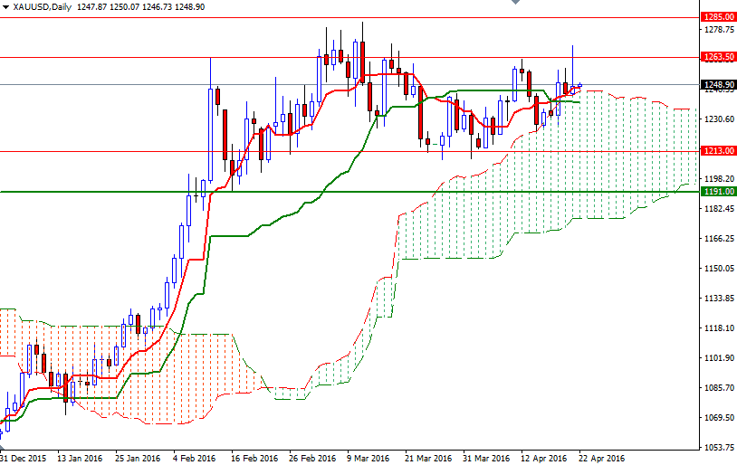 The XAU/USD is currently trading at $1248.34 an ounce as the market is being supported by the daily Ichimoku cloud. The 1246/3 region has been supportive in the past so it may be troublesome for the bears. If prices can break through the 1253/1 resistance, then the 1258.60-1256.50 area could be the next port of call. Since a bearish trend line, a horizontal resistance and the 4-hourly Tenkan-sen (nine-period moving average, red line) converge in this particular zone, it would not surprise me if prices stall. Beyond that, sellers will be waiting at around 1263.