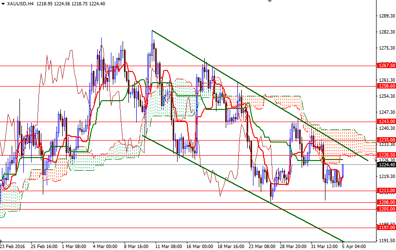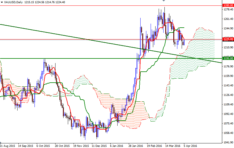 Apparently market participants are giving more weight to Yellen. The XAU/USD pair is currently trading at $1224.40 an ounce, higher than the opening price of $1215.15, as the $1215.30-1213 support zone remains intact - as I pointed out last week, this is a strategic camp for bears to capture in order to pull prices towards $1208/5. The medium-term directional bias remains bullish, with the market trading above the weekly and daily Ichimoku clouds, but the 4-hourly chart suggests that the market is not out of the woods yet.