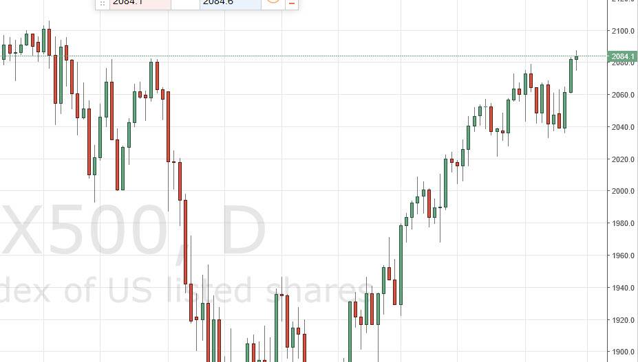 The S&P 500 initially fell during the course of the session on Thursday, but turned back around to form a bit of a hammer. The hammer at the top of a trading range like this normally means that the buyers are getting ready to come back into the marketplace, and continuing to push to higher levels. I believe that the market is trying to reach towards the 2100 level, and then perhaps even above there. I think that short-term pullbacks will continue to find plenty of buyers though, even if we break the back of the hammer from the Thursday session.