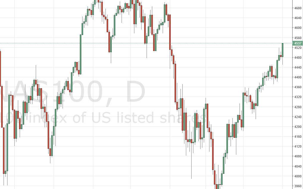 I believe that the 4400 level will serve as a bit of a floor, but quite frankly I would be very surprised to see us reach down to that area anyway. Ultimately, I anticipate that this market will reach towards 4725, but there could be pullbacks from time to time. Again though, in this market I believe that is simply going to be value that traders will return to again and again. There is no scenario in which I’m comfortable selling the NASDAQ 100 as it tends to be one of the faster moving indices in America, so it makes quite a bit of sense that it will reach the upper targets quicker than the S&P 500, or even the Dow Jones Industrial Average.