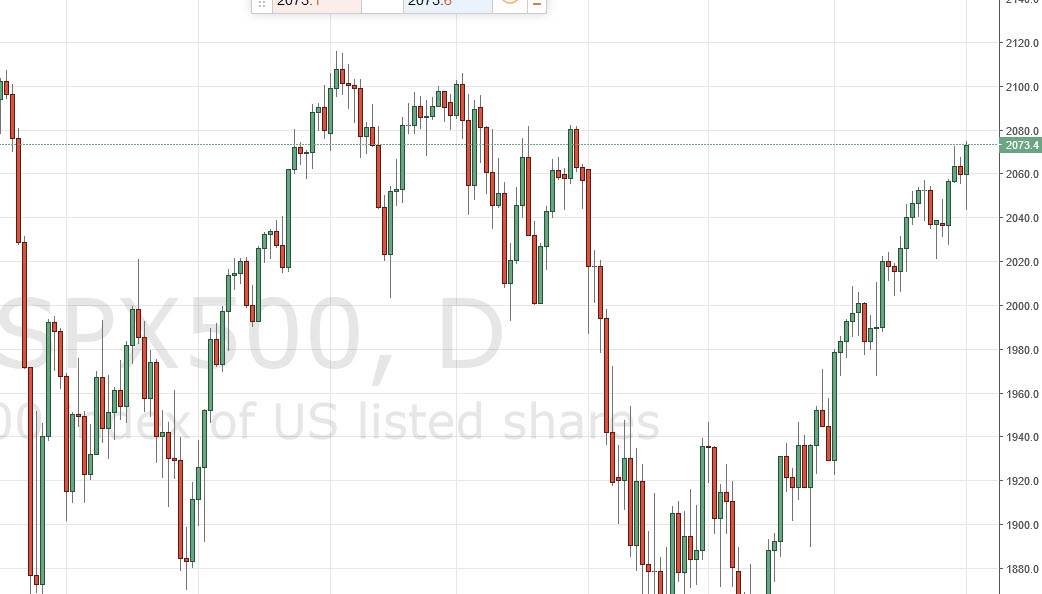 During the Friday session, the Nonfarm Payroll Numbers came out slightly better than expected at 215,000 for the month of March, as opposed to the expected 205,000. Initially, the S&P 500 fell during the day but found quite a bit of strength as we shot higher. We ended up forming a very positive looking candle, and I believe that we are now going to continue to grind away towards my expected target of 2100.