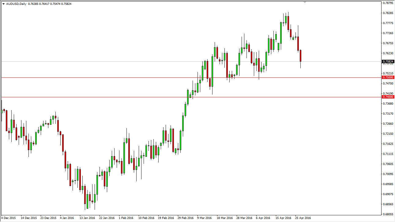 The Australian dollar fell rather significantly during the day after receiving fairly negative news out of Australia in the form of economic announcements. However, this is a market that has a massive amount of support below at the 0.75 level and extending down to the 0.74 handle. With this being the case, I am simply waiting for some type of supportive candle to start buying. I may trade off of a lower time frames charts, but will continue to consult the daily chart for signs of which way to go. I think it’s not until we break down below the 0.74 level that it’s going to be able to be sold, as this market has seen such a bullish move recently. I would also point out that there is potentially an uptrend line that coincides with the area above the 0.74 handle, so that could tie together quite nicely to start buying. One thing I do know: there is going to be a lot of volatility and we will have to pay attention to gold markets as well, as they could be the main driver to the upside.