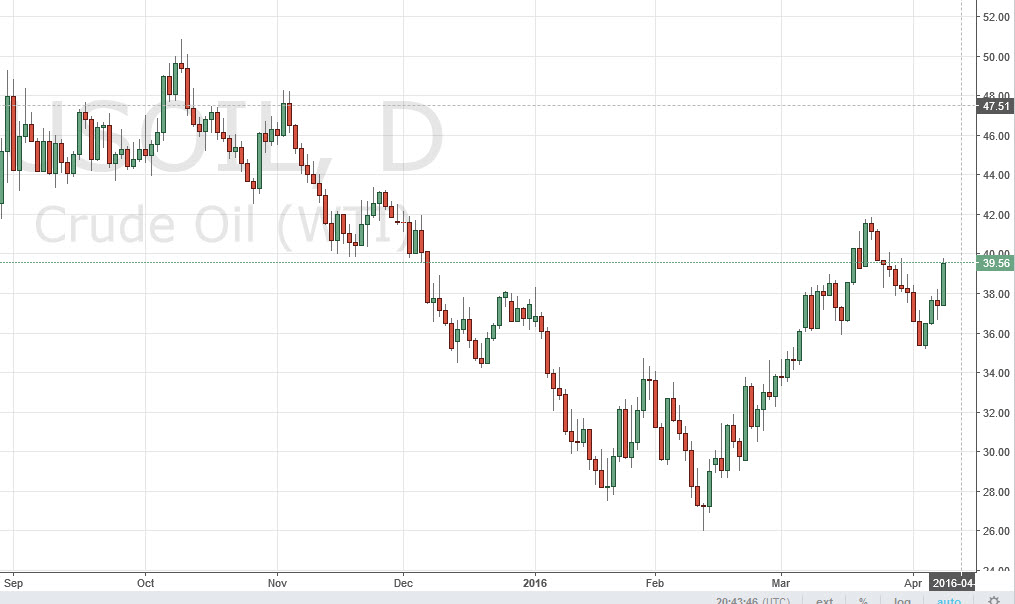 The WTI Crude Oil market broke higher during the session on Friday, breaking above the top of the range for the Thursday session. The market ended up rallying over 5% during the day, testing the $40 level for resistance. That is of course a large, round, psychologically significant number. Ultimately, and exhaustive candle would be a nice selling opportunity, even though it does look like we do have quite a bit of bullish pressure. Ultimately though, I am a bit hesitant to buy this market for several different reasons.