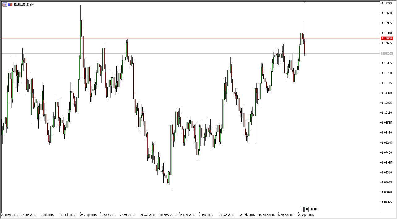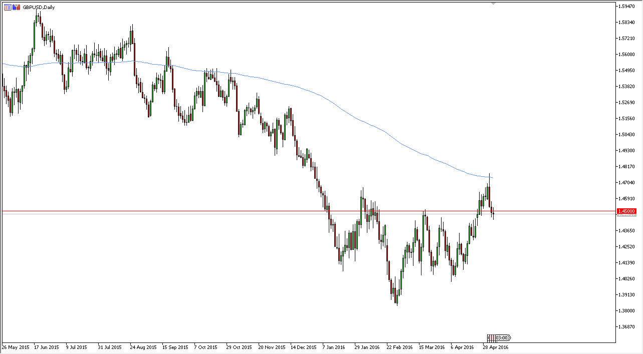 The British pound did very little during the day on Thursday, as we continue to bounce around just below the 1.45 level. The level offered a bit of resistance, and it looks as if we are going to continue see it here. This being the case, I would anticipate that we are going to have quite a bit of volatility today, especially considering that we have the Nonfarm Payroll Announcement. Because of this, it could very well be a very quiet session during the day until we get that announcement, so therefore it will more than likely be a knee-jerk reaction that we get, and that means that it will be a bit difficult to trade. Because of this, I am going to wait until we get a daily close in order to place my position on. One thing that I would bring to your attention is that we recently pulled back from the 200 day exponential moving average, so it is worth paying attention to. Perhaps we are going to break down, but at this point in time we will have to get through the Friday session in order to make that decision.
