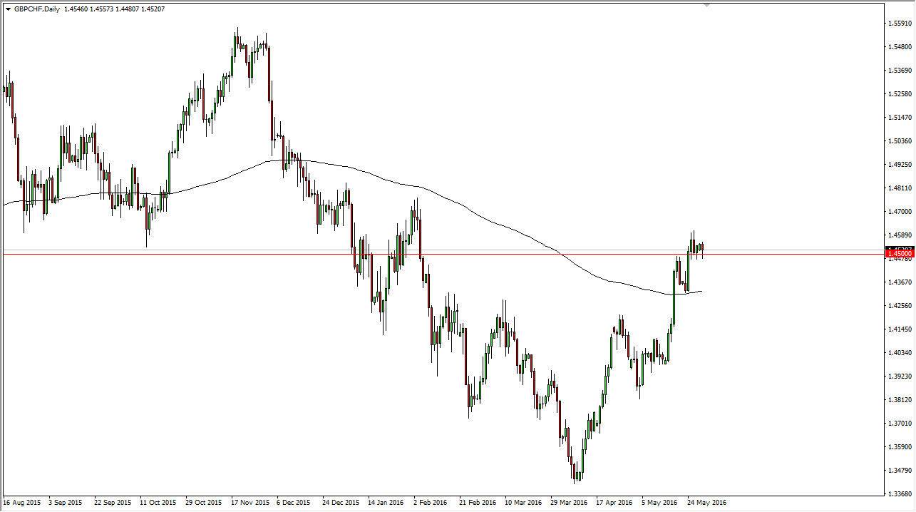 During the course of the session on Monday, the GBP/CHF pair initially tried to fall, but found enough support at the 1.45 level to turn things around and form a bit of a hammer. The hammer of course is a bullish sign, and therefore I think that buyers will be interested in this market. On top of that, we have the GBP growing in general, so with that being the case I suspect that this pair will simply go right along with the rest of the British pound related pairs. I like the 1.45 level for support, and as a result it makes sense to see buyers enter the market in this area. The pair has been in a nice uptrend for some time, and we even had a few very impulsive candles over the last couple of weeks.