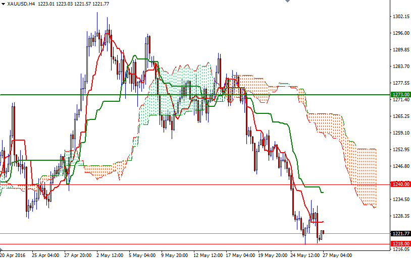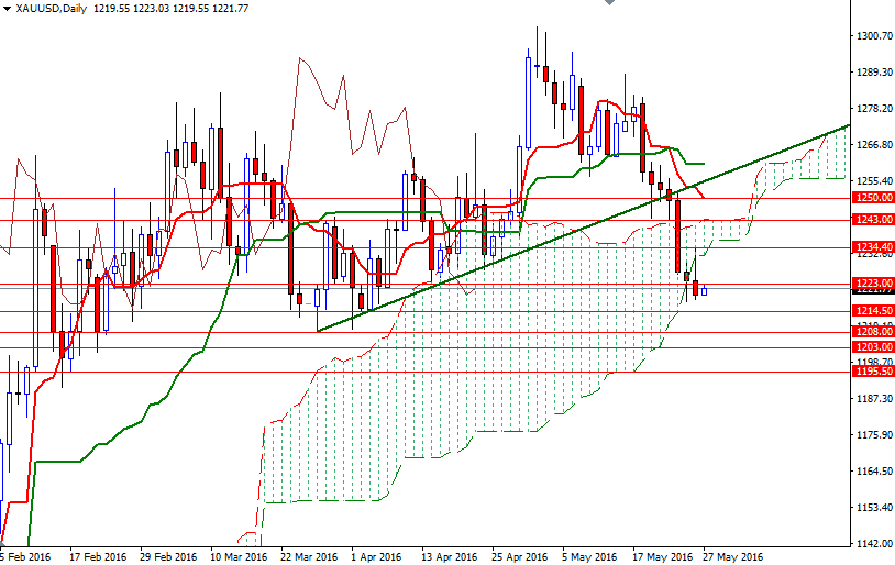 Gold prices ended Thursday's session down $4.36, to settle at $1219.66 an ounce as investors focused on positive economic data backed the case for the Federal Reserve to continue raising interest rates this year. The XAU/USD pair initially rose during yesterday's session but we encountered selling pressure at $1234.40 level where the daily and hourly Ichimoku clouds overlapped. Data from the Commerce Department showed that demand for durable goods increased 3.4% in April and the Labor Department reported that the number of Americans filing first-time claims for unemployment insurance payments decreased by 10K to 268K.