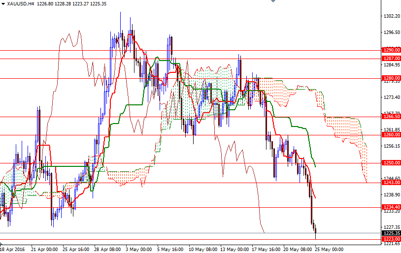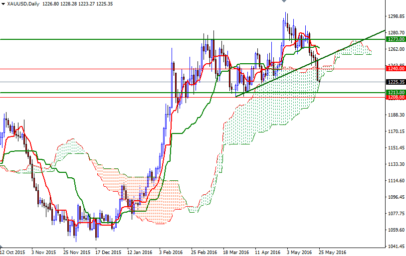 Better-than-expected housing data was also behind yesterday's drop in prices. The Commerce Department data showed sales of new homes jumped 16.6% to a 619000 annualized pace, and figures for the first quarter were revised higher. XAU/USD is currently trading at $1225.35 an ounce, slightly lower than the opening price of $1226.80. As I pointed out in my weekly analysis, the 1213 level -where the bottom of the daily Ichimoku cloud sits- stands out as the first significant support so it would not be surprising to see some profit taking.