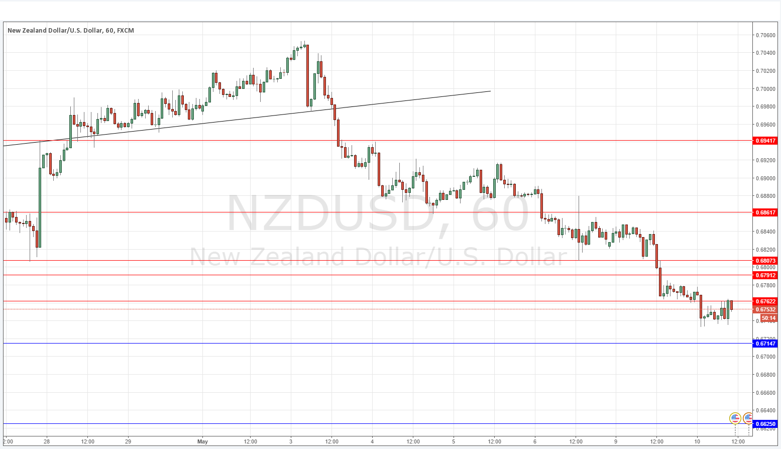 The NZD has become one of the weakest currencies over the past week or so. During the past day it broke down below three support levels, all of which look to have been flipped to become resistances. In particular, the price seems to be rejecting 0.6762 at the time of writing.