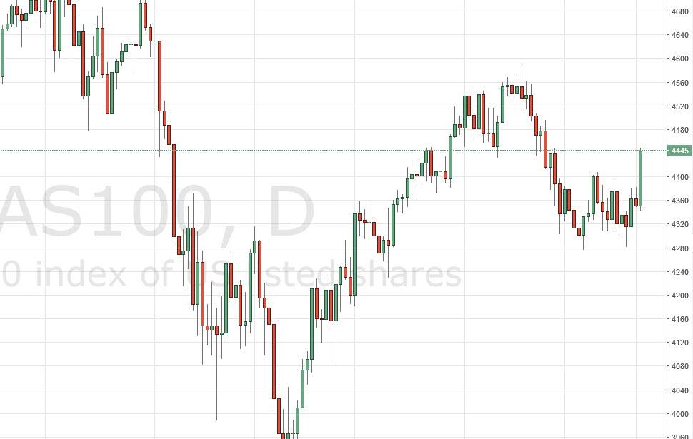 Quite frankly, I don’t have any interest in selling this market at all, least at this point in time in would need to see a longer-term signal to even act. There is a massive amount of noise below the 4280 level and as a result we should continue to see buyers enter this market again and again. With this, I really like going long of the NASDAQ 100, and it could very well outperform the rest of the US indices.