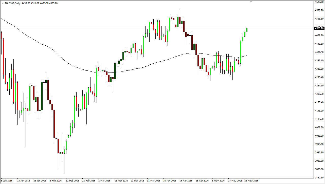 The S&P 500 had a slight gain during the course of the day on Friday and it looks now like we’re going to try to break out to the upside. We ended up just below the 2100 level, an area that of course has been very resistive. With this, I think we can make a fresh, new high we will see buyers flood into this market and push the market into a “buy-and-hold” type of situation. Pullbacks at this point in time will more than likely have quite a bit of support just below, so with this being the case this is essentially a “buy only” type of market as far as I can see. Also, it appears that the Federal Reserve isn’t going to do anywhere near as many interest-rate hikes as once thought, so that of course is good for stocks markets in general.