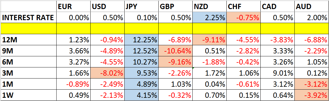 Let’s take a look at the relevant data of currency price changes and interest rates to date, which we compiled using a trade-weighted index of the major global currencies: