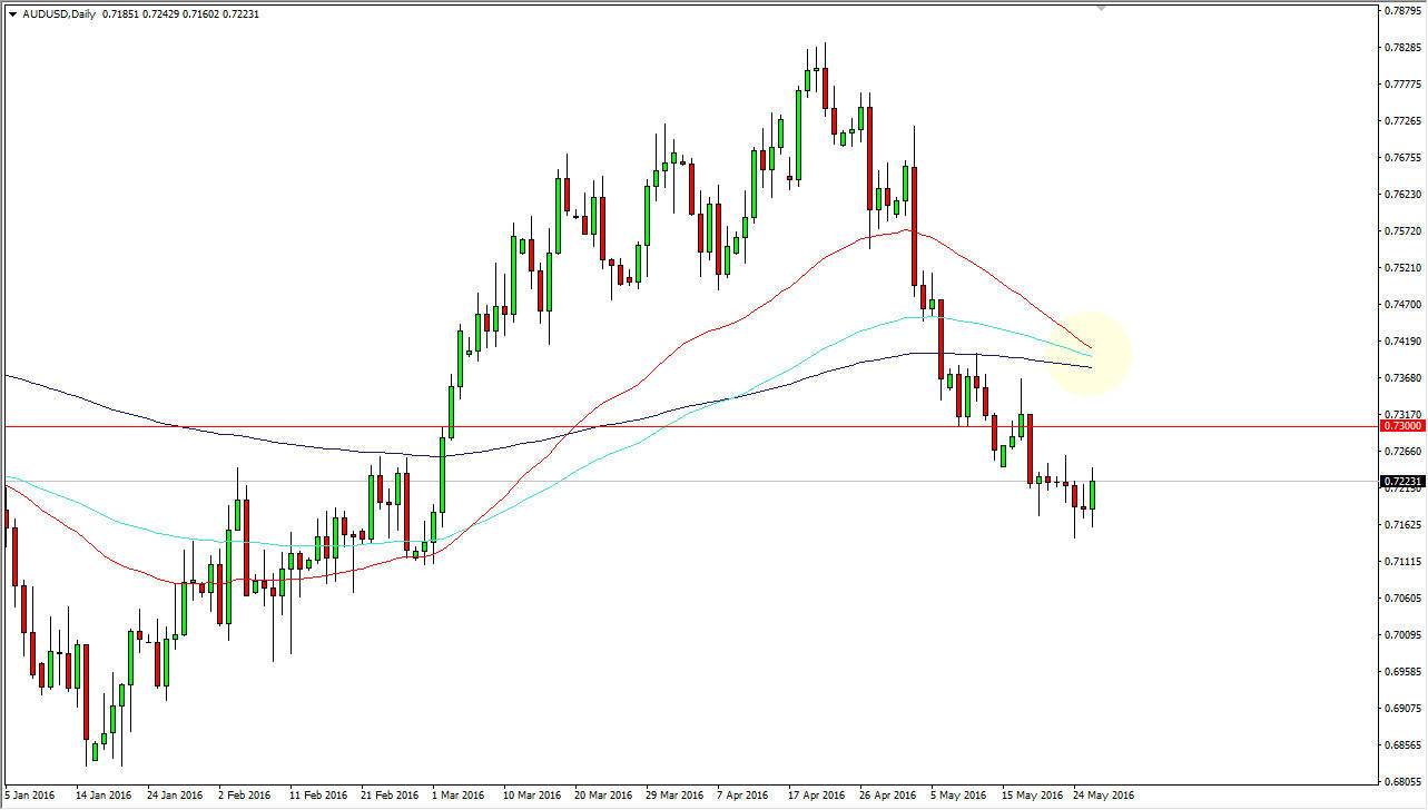 The AUD/USD pair initially tried to fall during the day on Thursday, but turned right back around to form a positive candle. There is a significant amount of resistance just above, and that it extends all the way to the 0.73 level. With this, I’m waiting to see whether or not we get a short-term rally that show signs of exhaustion so I can start selling. Even if we break above there, I believe that the market has been interesting area above, as the 50, 100, and 200 day exponential moving averages are getting ready to cross as denoted by the yellow circle on the chart. I think that this is a market that can be almost impossible to start buying, at least until we break above the moving averages that I have highlighted.