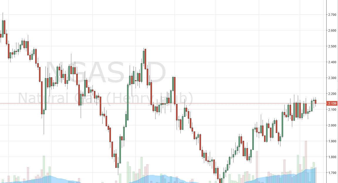 Natural gas markets fell slightly during the course of the day on Thursday as we continue to meander just below the $2.20 handle. Natural gas is an interesting market at the moment as it appears that the bullish pressure continues to build to the upside, but the longer-term fundamental outlook for natural gas is absolutely horrific. Currently, there are at least 14,000,000,000,000 ft.³ of reserves in the ground in the United States alone waiting to be drilled. This of course is going to keep natural gas in a bearish market over the longer term, but presently a lot of natural gas drillers have stepped away from the fields as the market is still awash in excess natural gas. On top of that, the northeastern United States is without a doubt the largest consumer of natural gas in the world, and as we step into the warmer months there will be a lot less demand.