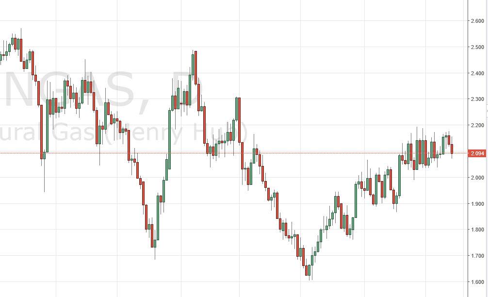 I would need to see some type of longer-term signal or a break above the $2.20 level to start buying, just as I would need to see this market break down below the $2 level to start selling with any longer-term aspirations in mind. In the meantime, I believe we just simply have to buy and sell as you get towards the outer reaches of the range.