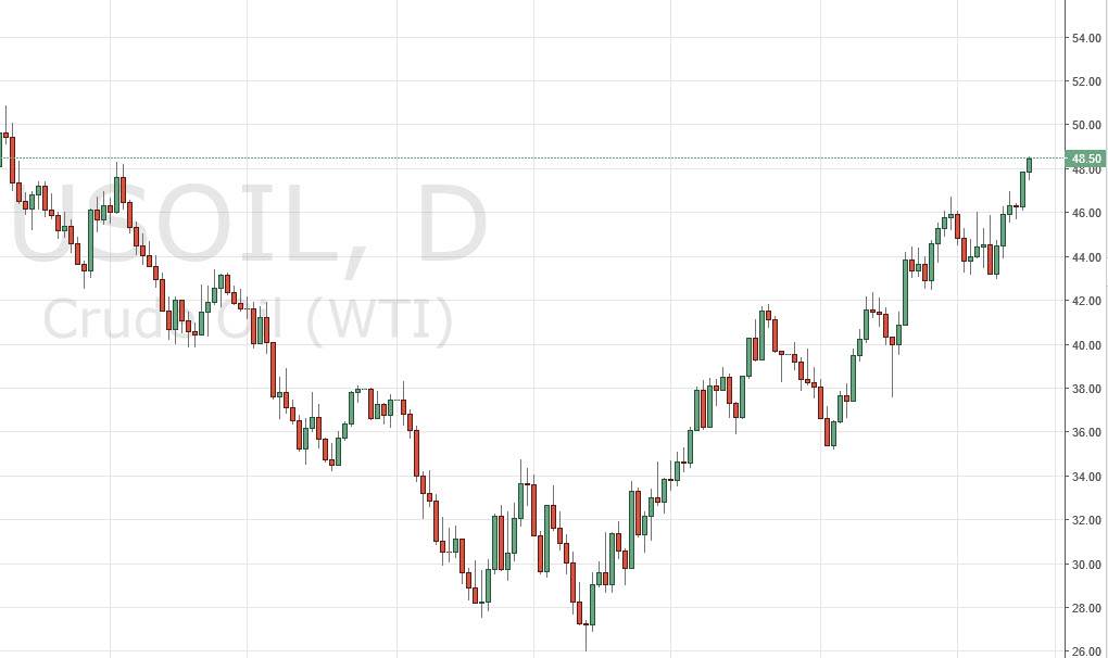 The WTI Crude Oil market rose slightly during the course of the day on Tuesday, as we broke above the $48 level. It now appears that the market is trying to reach towards the $50 handle, an area where I anticipate that there will be a lot of resistance. After all, it is a large, round, psychologically significant number, and those areas tend to cause a bit of trouble. Any resistive candle in that area could be a short-term selling opportunity but quite frankly I feel that the only way to sell this market is to do it off of a longer-term chart and a longer-term signal. Pullbacks at this point in time will more than likely find plenty of support near the $46 handle below.