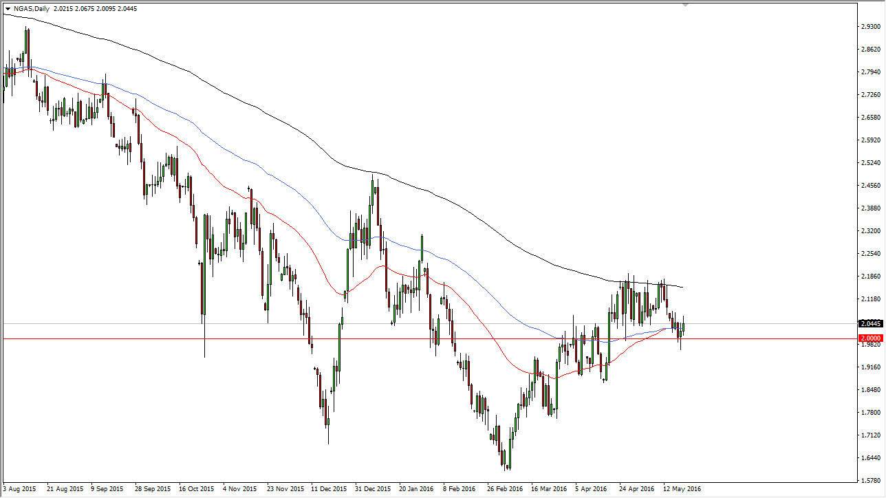 Natural gas markets rose slightly during the course of the day on Friday, breaking the top of the hammer that formed on Thursday at the psychologically significant $2.00 level. The chart attached to this article has 3 moving averages on it, they 50 day exponential moving average, the 100 day exponential moving average, and then the 200 day exponential moving average. The red 50 day exponential moving average has started to try to cross above the 100 day glued exponential moving average. This is the first sign that perhaps the overall trend could be trying to change. However, we have the 200 day exponential moving average just above, and it should continue to act as dynamic resistance.