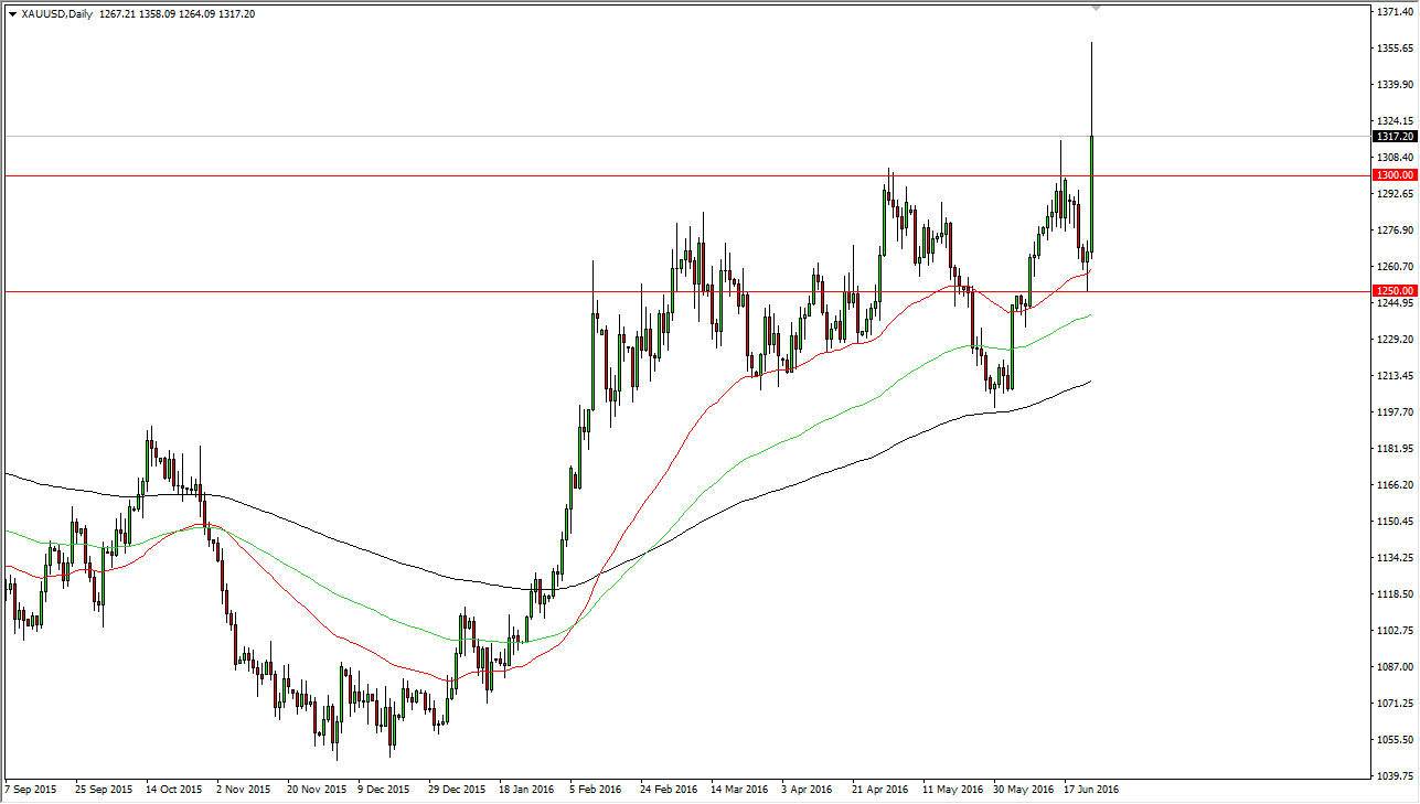 Gold markets absolutely skyrocketed during the course of the session on Friday, as it was announced that the United Kingdom was leaving the European Union. This of course sends quite a bit of fear into the financial markets, and people are starting to buy gold more or less as a bit of “hard currency” instead of trying to deal with the Pound or the Euro. In other words, money is running away from Europe in general.