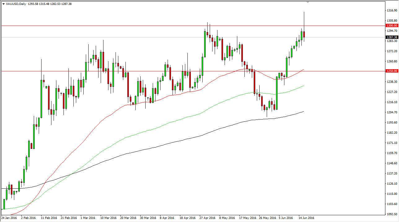 Gold markets had a very volatile session on Thursday, as we finally broke above the $1300 level. This was a major barrier as far as I can see, and I assumed that it would signal the next leg higher. However, we turned back around to form a massive shooting star and therefore it seems like we have a lot of questions and perhaps may have only found more questions instead of answers during the day. After all, the shooting star is a very negative sign but at the end of the day we did break out to higher levels than we had previously seen. In other words, we broke through a bunch of resistance only to turn back around.