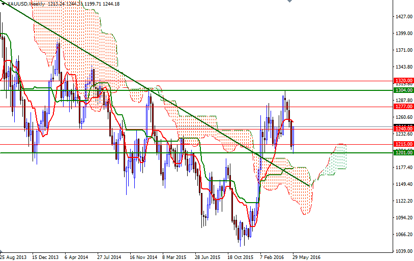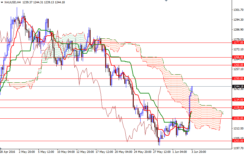 Gold prices settled at $1244.18 an ounce on Friday, making a gain of 2.52% on the week, as disappointing U.S. jobs data dimmed the prospect of an interest rate hike by the Fed in the near term. The XAU/USD pair, which steadied after hitting the lowest level since February 17 earlier in the week, spent some time consolidating between $1205 and $1220 levels. The market broke above the $1220 level after the Labor Department reported that nonfarm payrolls grew by just 38K in May, well below consensus estimates of 159K, and gains for the prior two months were revised down by a total 59K.