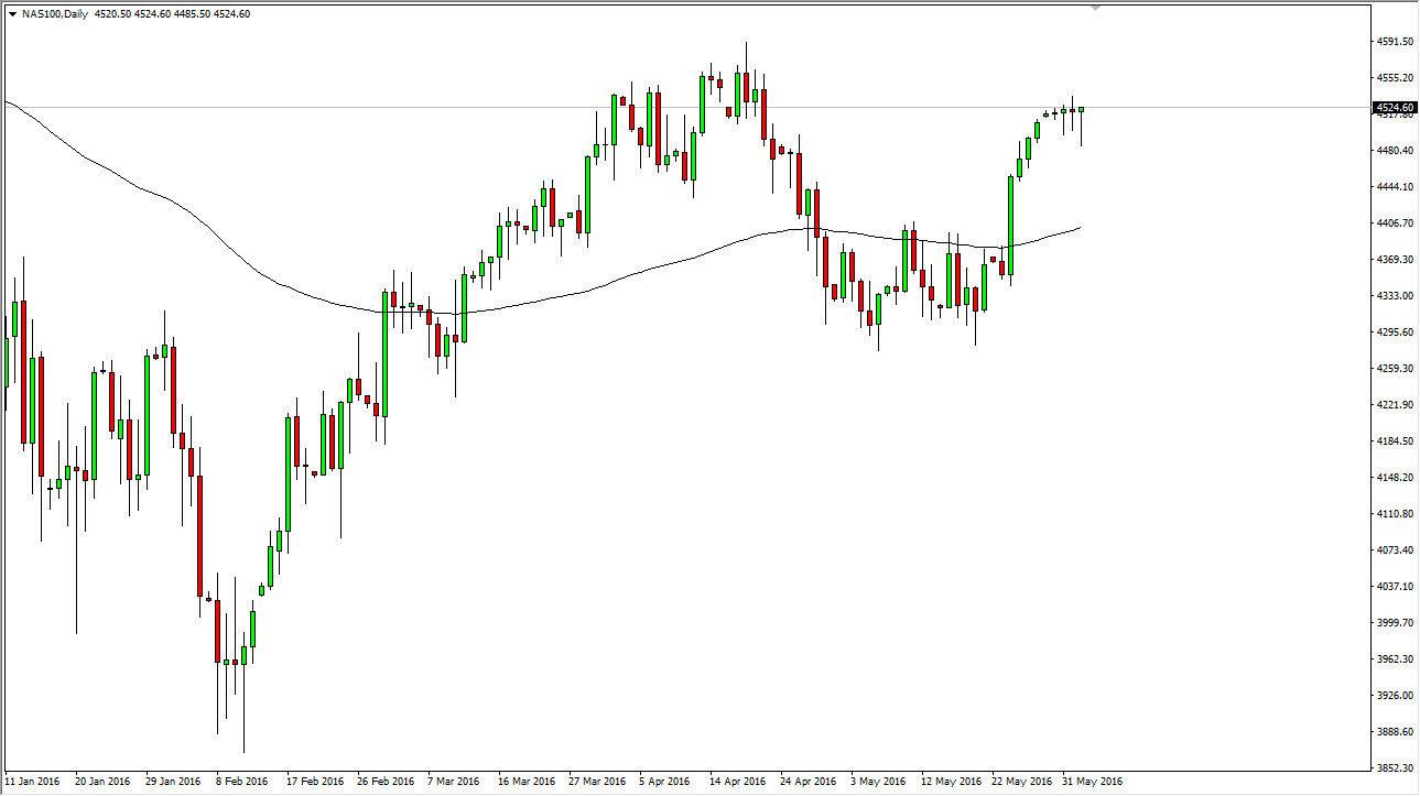 Obviously, with the Nonfarm Payroll Numbers coming out during the day today, there will be quite a bit of volatility. With this being the case, it’s likely that the market will be difficult to deal with, but the fact that we continue to form supportive candles suggests that buyers are more than likely are going to continue to push given enough time. Pullbacks, should offer value that people will take advantage of. I have the 100 day exponential moving average market on this chart, which was previously resistance, should now offer support. Quite frankly, I believe that eventually we will break above the 4600 level, which would signal a longer-term “buy-and-hold” type of situation just as we could very well have in the S&P 500.