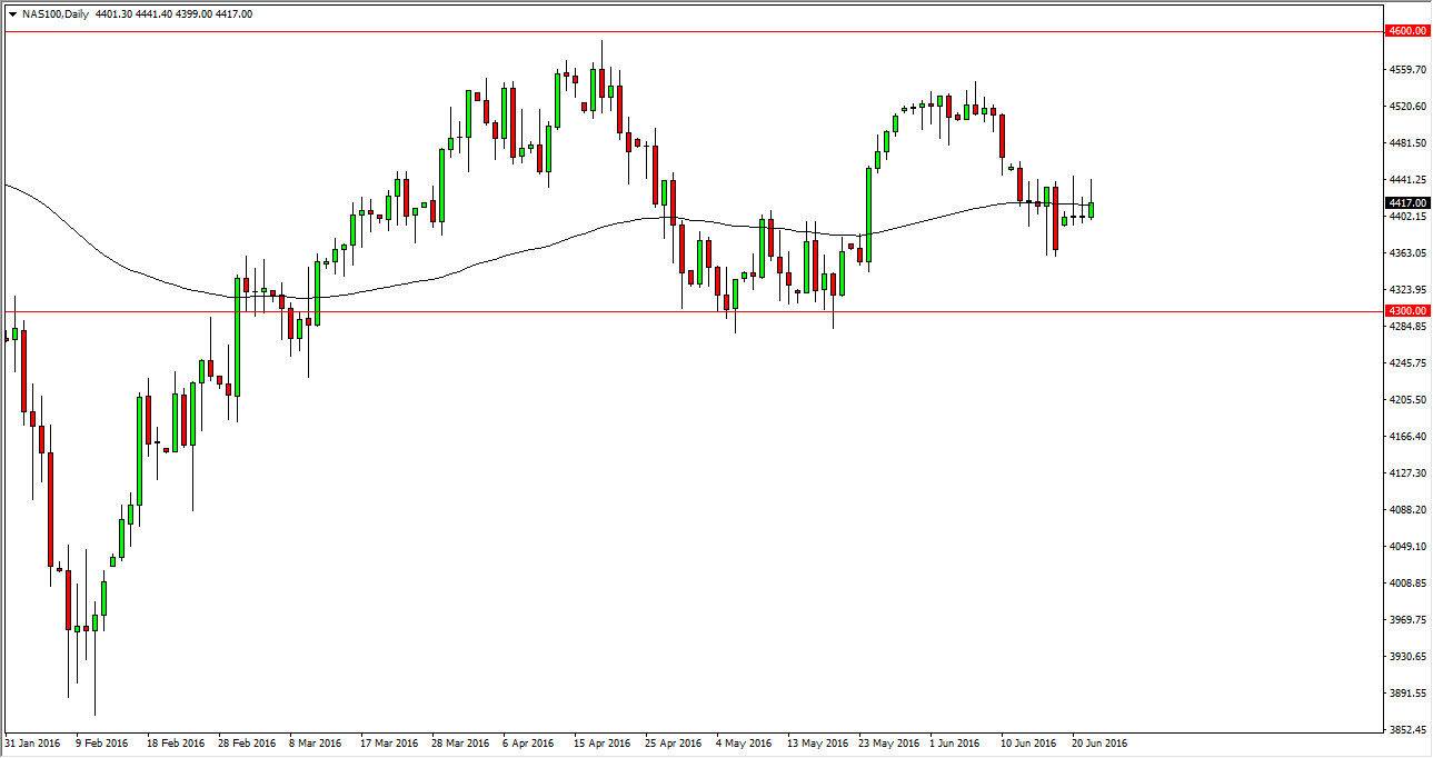 The NASDAQ 100 initially tried to rally during the day on Wednesday, but turned back around to form a shooting star for the session. We also got the same shooting star on Monday and Tuesday, so this point in time it appears of the market simply cannot go anywhere. If we can break above the shooting star from the day though, at that point time I feel that the market could probably reach towards the 4500 level. Ultimately though, does look like we’re going to struggle so a slight pullback may be coming. There is so much in the way of support below though that I do not think that any fall from here will have any great momentum. In fact, I believe that the 4300 level will continue to be the bottom of the overall consolidation that the market is paying attention to. We are waiting for the European Union referendum vote in the United Kingdom, so it’s difficult to imagine that any real conviction will be shown in the markets today, as we are waiting to figure out what happens next.