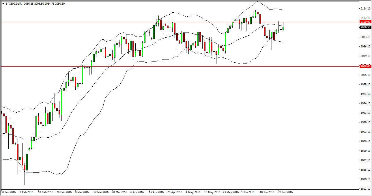 The S&P 500 initially tried to rally during the course of the session on Wednesday, but turned back around to form a shooting star. It is at the median line of the Bollinger Bands, as the markets continue to go sideways and weight upon the answer coming out of the United Kingdom as far as the European Union is concerned. We do not get the answer until tomorrow, so it’s very likely that this will be a very quiet session and therefore I don’t have any real interest in trading the S&P 500. If we did break above the 2100 level though, that would be a positive sign and I think at that point we could reach towards the 2120 level.