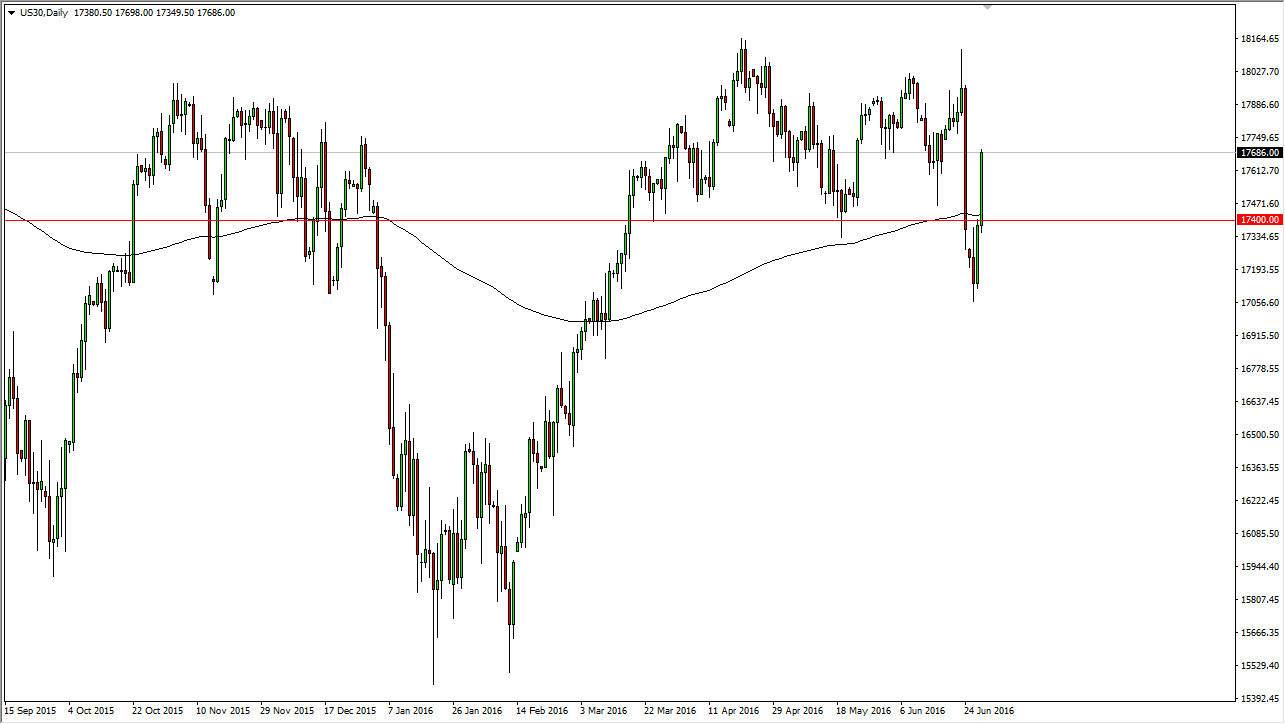 The S&P 500 shot higher during the course of the session on Wednesday, breaking well above the 200 day exponential moving average. Because of this, I feel that the US stock markets will probably continue to go higher. I think that pullbacks in the S&P 500 will offer buying opportunities as we continue to see quite a bit of bullish pressure. After all, most people overseas will look at the United States as a potential opportunity now that European indices should underperform. On top of that, it appears that the markets have calmed down and recognize that the United States should be fairly insulated against the breakup between the United Kingdom and the European Union. The size of the candle is very bullish, and as a result it looks as if the buyers are going to continue to push this market.