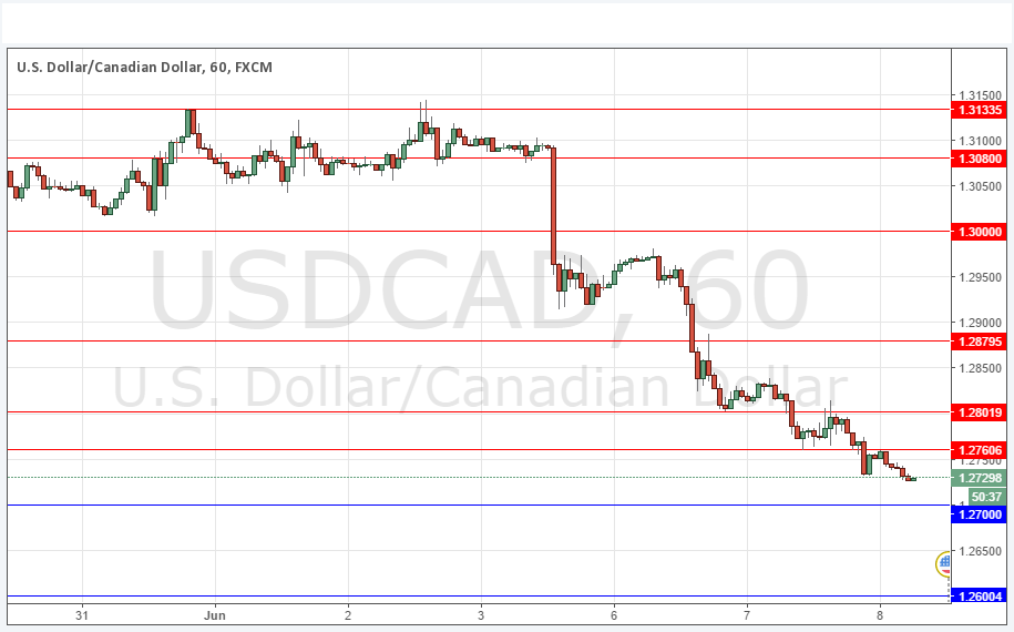 The strong bearish trend continues, with the price invalidating the anticipated support at the key psychological number of 1.2750. There is little high-impact news due today so the trend is likely to continue. However Crude Oil is a bigger factor than most affecting this pair so a big surprise in the inventories data could cause a change in movement.
